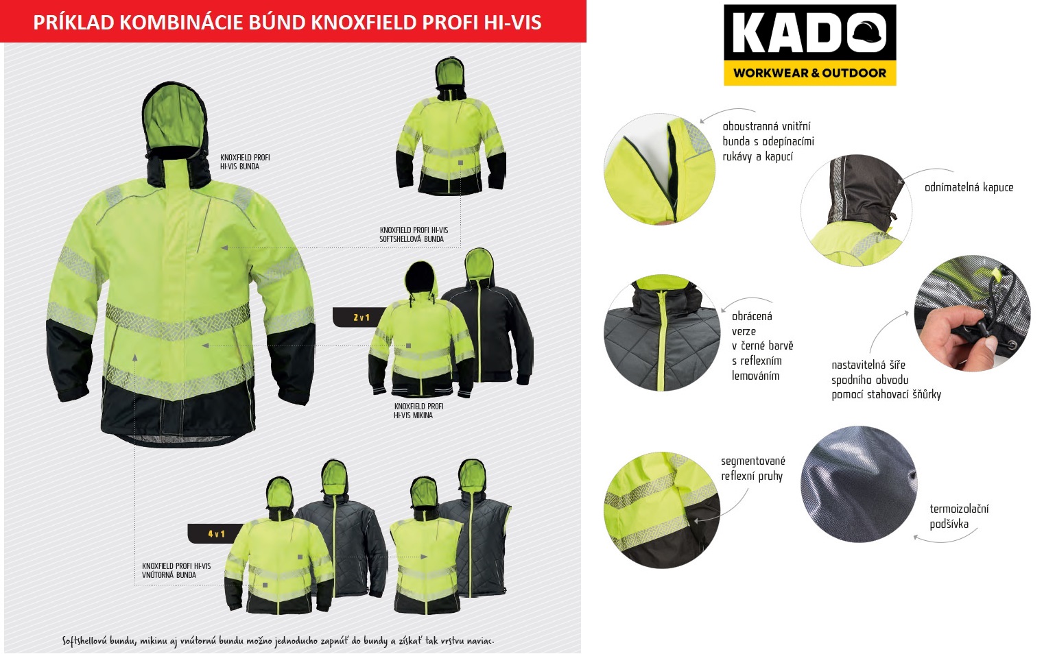 Ako vrchná vrstva slúži nepremokavá vetruodolná bunda s termoizolačnou podšívkou. Ľahko do nej zazipsujete ďalšiu bundu alebo mikinu z radu PROFI, podľa počasia a vašich potrieb. Vnútorná bunda sa dá nosiť aj dvoma spôsobmi, buď s HI-VIS dizajnom, alebo s čiernym navrchu. Séria KNOXFIELD PROFI vás ochráni pred vetrom, dažďom, chladom a navyše vám zaručí, že budete vždy videní aj v tme či hmle.