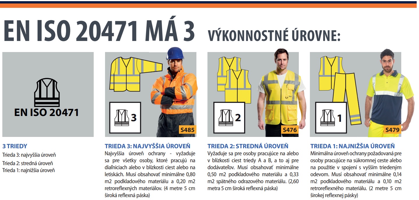 ✔️ Norma EN ISO 20471 – pre prácu v rizikovom prostredí s požiadavkou na viditeľnosť.